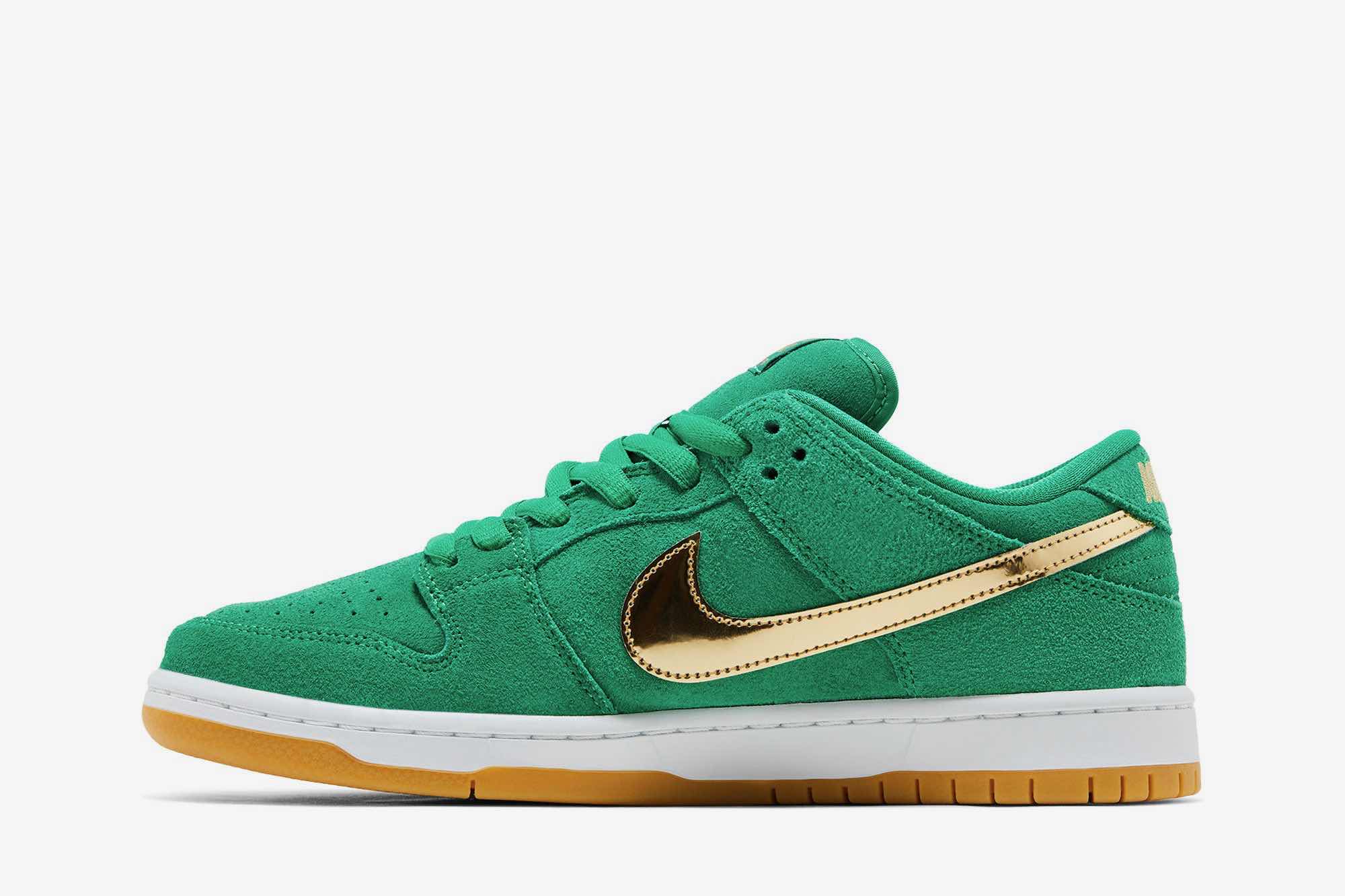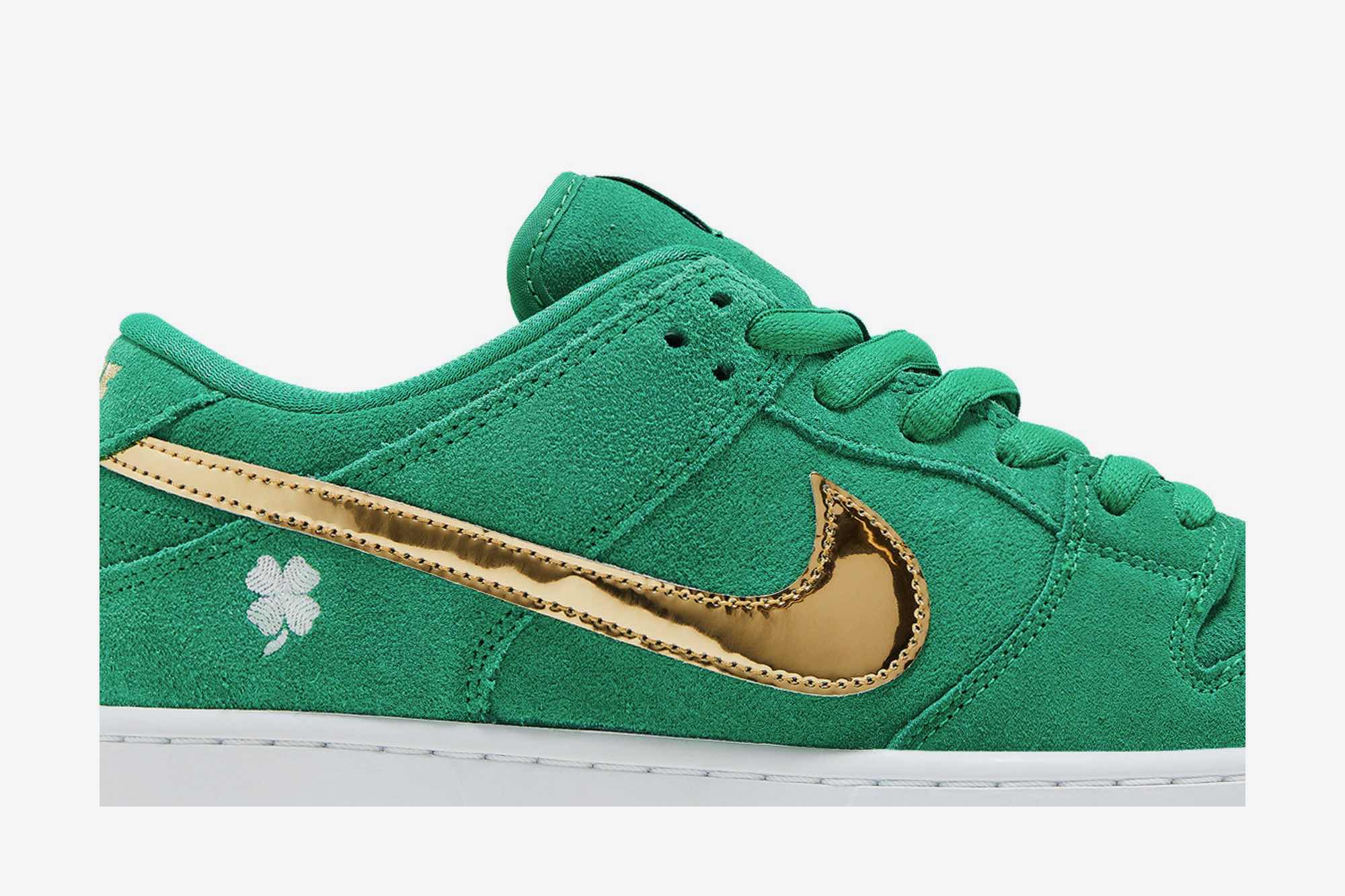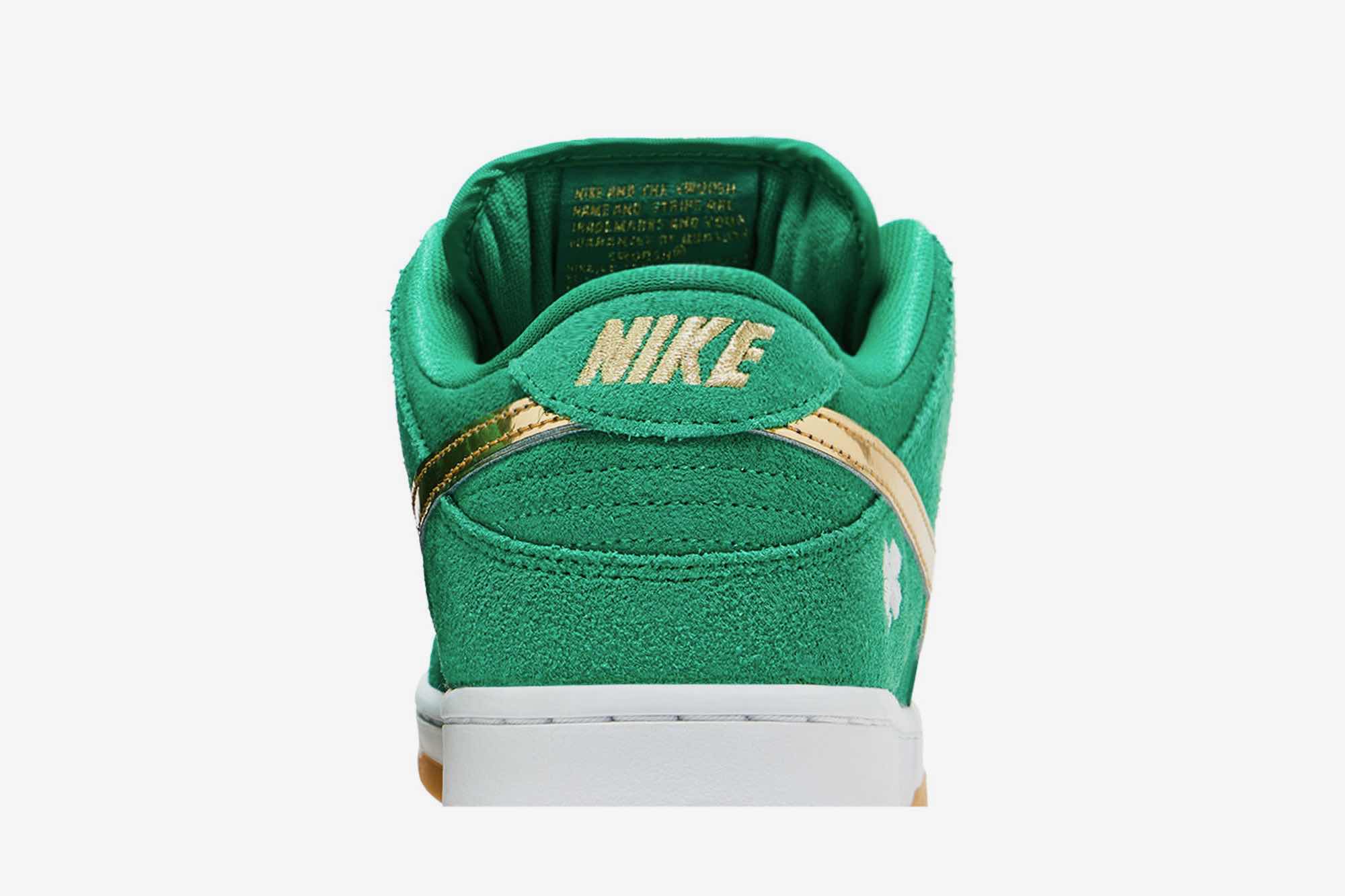 The Nike Dunk Low SB ‘St. Patrick’s Day’ celebrates the beauty of Irish culture with an iconic shoe. The Lucky Green suede features contrasting Metallic Gold details, including the Swooshes, tongue and heel branding, as well as a four-leaf clover on the lateral heels for a striking look. Set atop a White midsole and Gum rubber outsole, this special edition sneaker will add flair to any outfit while expressing your appreciation of Irish history. Wear celebrating St. Patrick’s Day or simply because you love great shoes!