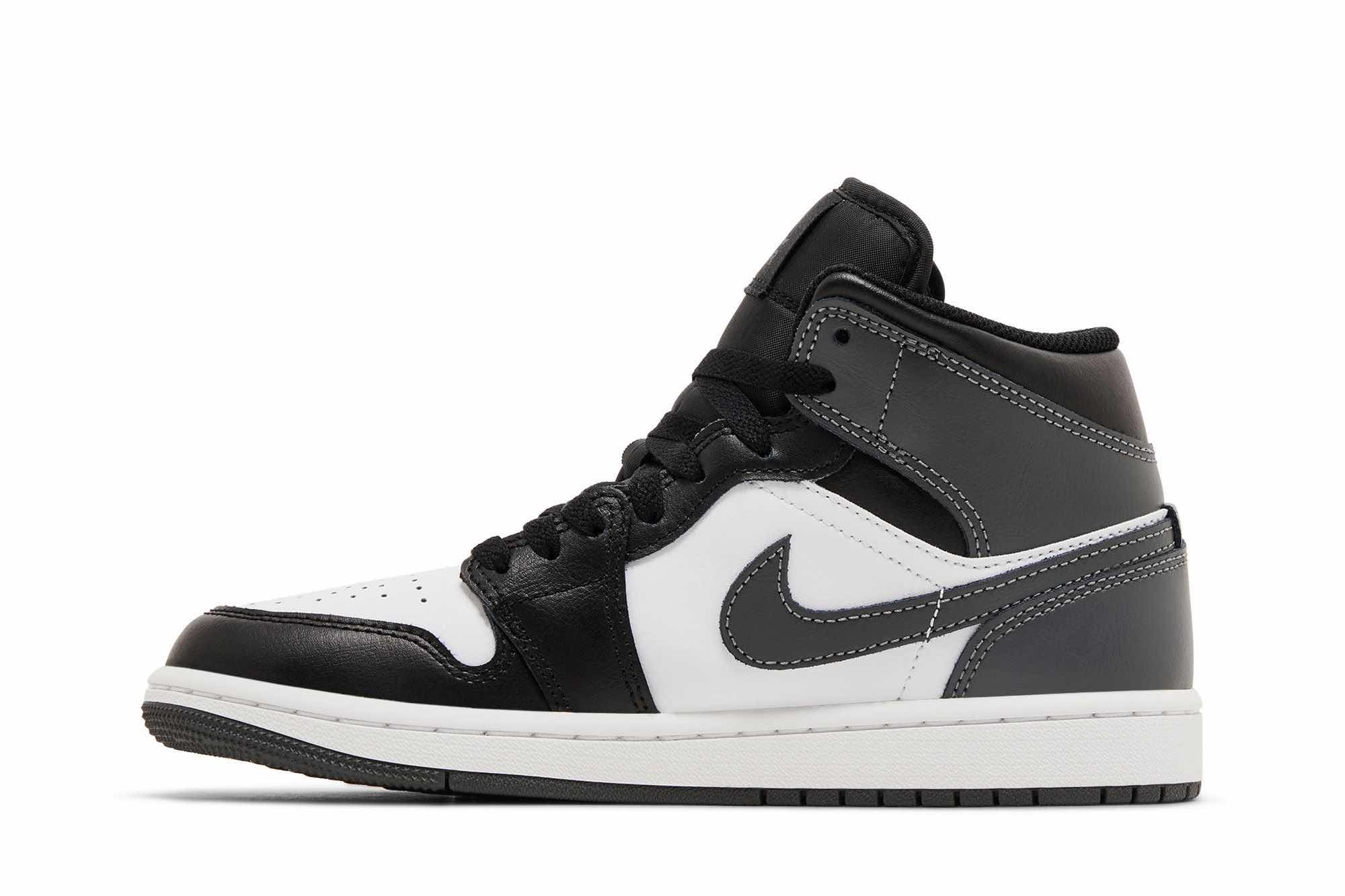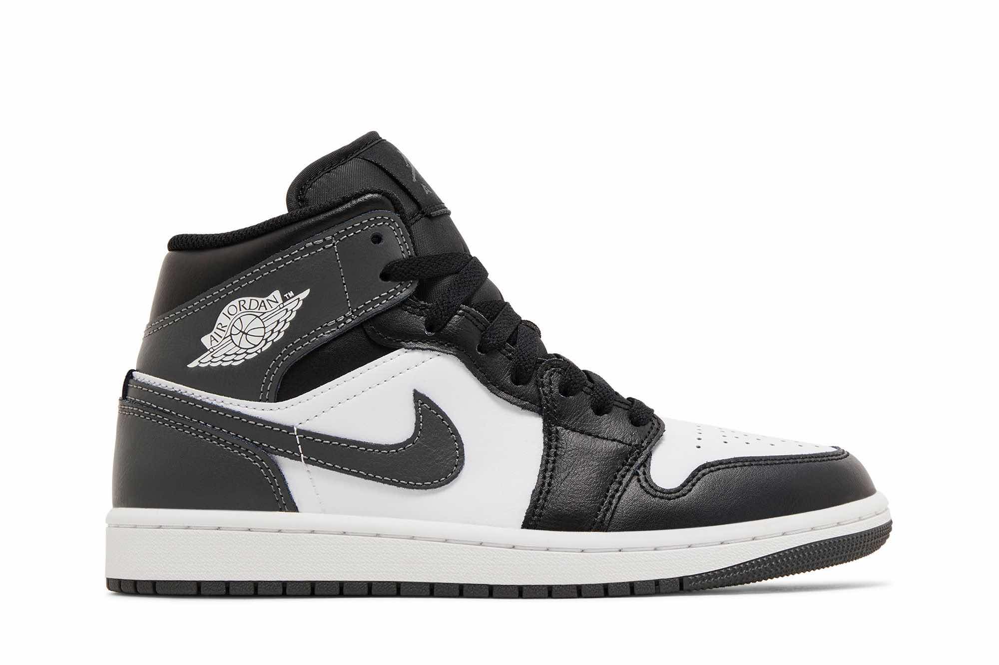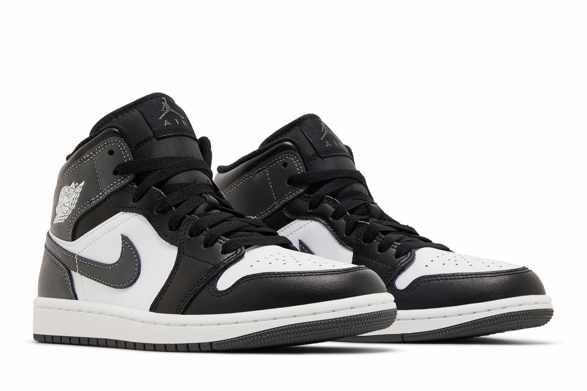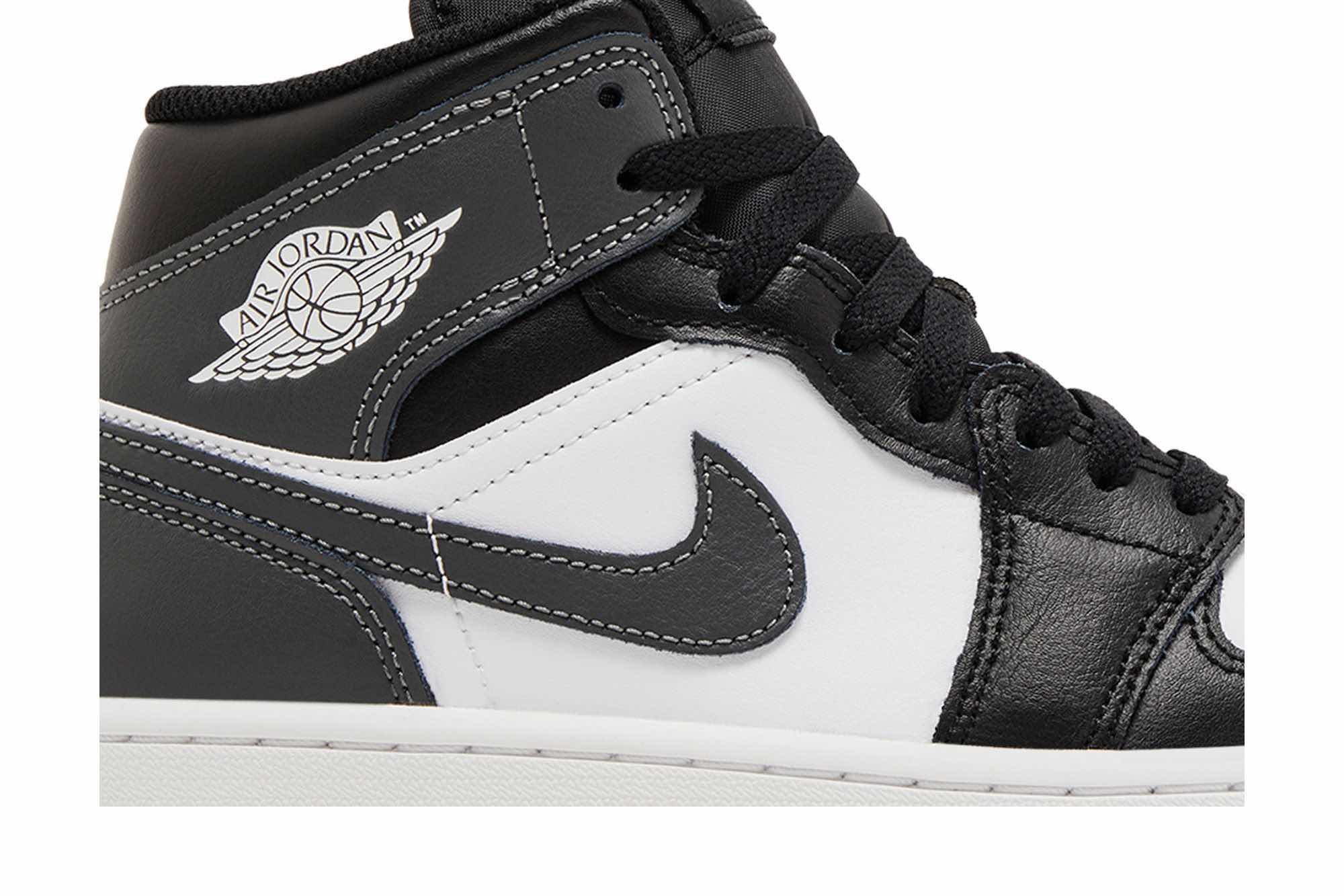 The Air Jordan 1 Mid ‘Iron Grey’ makes use of a smooth leather upper, featuring a crisp white base with a contrasting black forefoot overlay. Dark grey accents settle on the heel panel, Swoosh and collar flap, featuring a printed Wings logo on the lateral side. Jumpman branding adorns the sockliner and woven tongue tag. The sneaker rides atop a rubber cupsole with encapsulated Air-sole cushioning in the heel.