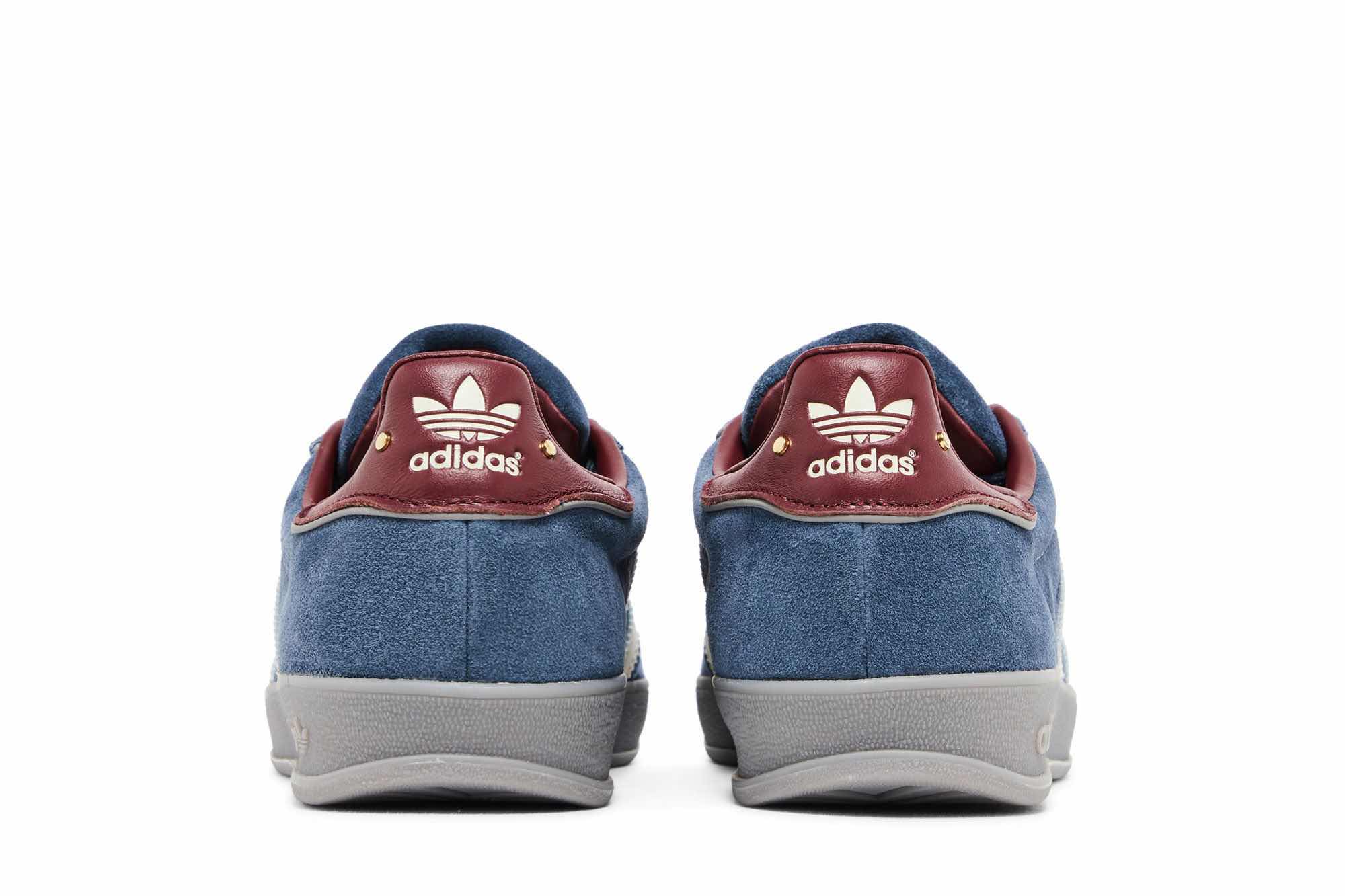 The Adidas Gazelle Indoor Crew Navy Burgundy is a stylish low-top sneaker with a navy suede and leather upper, featuring a light blue suede toe cap and white leather three stripes. The burgundy leather heel collar adds a pop of color, while the gray rubber outsole provides durable traction. This classic design is perfect for everyday wear.